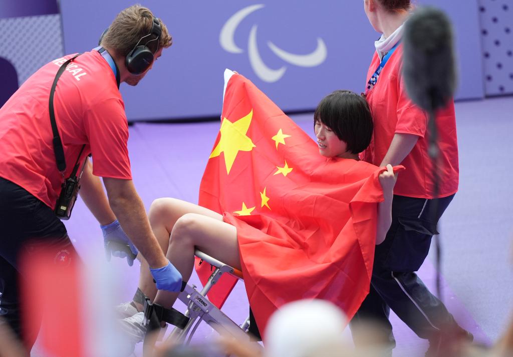 史逸婷在女子200米T36級(jí)決賽中拼到雙腿力竭,打破殘奧會(huì)紀(jì)錄奪冠。被攙上椅子后,她努力張開五星紅旗向全場展示。
