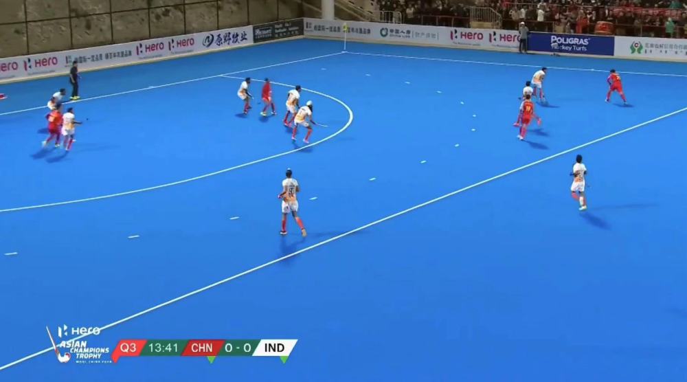 第二節(jié),面對印度隊(duì)的強(qiáng)勢進(jìn)攻,中國隊(duì)幾次成功搶斷,場面十分膠著。第三節(jié),印度隊(duì)在禁區(qū)內(nèi)攔球犯規(guī),中國隊(duì)獲得短角球,然而在印度隊(duì)嚴(yán)密的防守下射偏。隨著比賽的進(jìn)行,中國隊(duì)隊(duì)員體力有所下降,但依然在場上頑強(qiáng)拼搏。第四節(jié),印度隊(duì)通過團(tuán)隊(duì)配合取得進(jìn)球,中國隊(duì)調(diào)整戰(zhàn)術(shù),將守門員換下,全力進(jìn)攻,但未能扭轉(zhuǎn)局勢,最終以0:1惜敗。