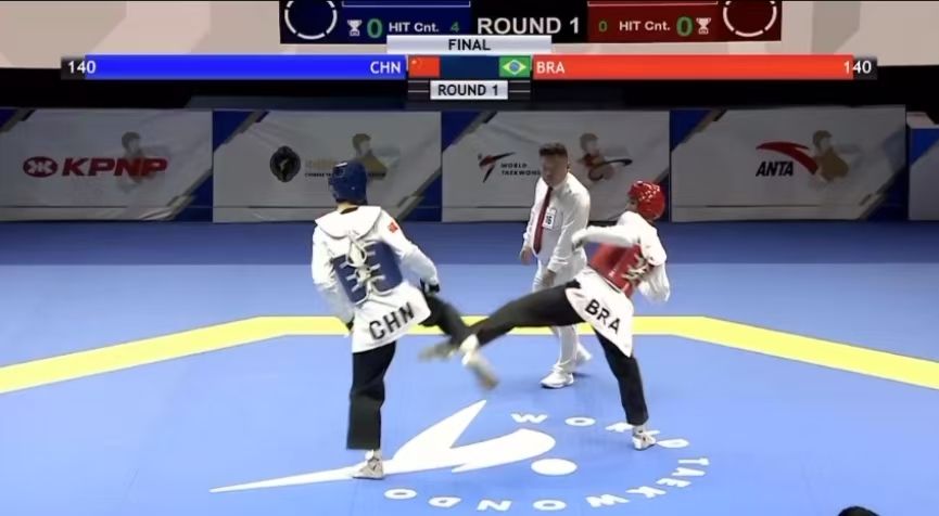 決賽首局比賽,中國隊肖樹楠以一個腹部踢擊得分加對手出界拉開分差,占據(jù)優(yōu)勢后中國隊持續(xù)迎擊,以能量值130:70獲勝。第二局中國隊開場防守松懈,被扣掉40分(能量值),盡管后程中國隊加強攻勢,還是以能量值65:75不敵對手。在決勝局中,巴西隊兩記直拳打開局面,能量值占優(yōu),此后雖然巴西隊兩次被判消極進(jìn)攻,但中國隊未能把握住機會,最終以能量值110:115輸?shù)舻谌?,大比?:2告負(fù)。
