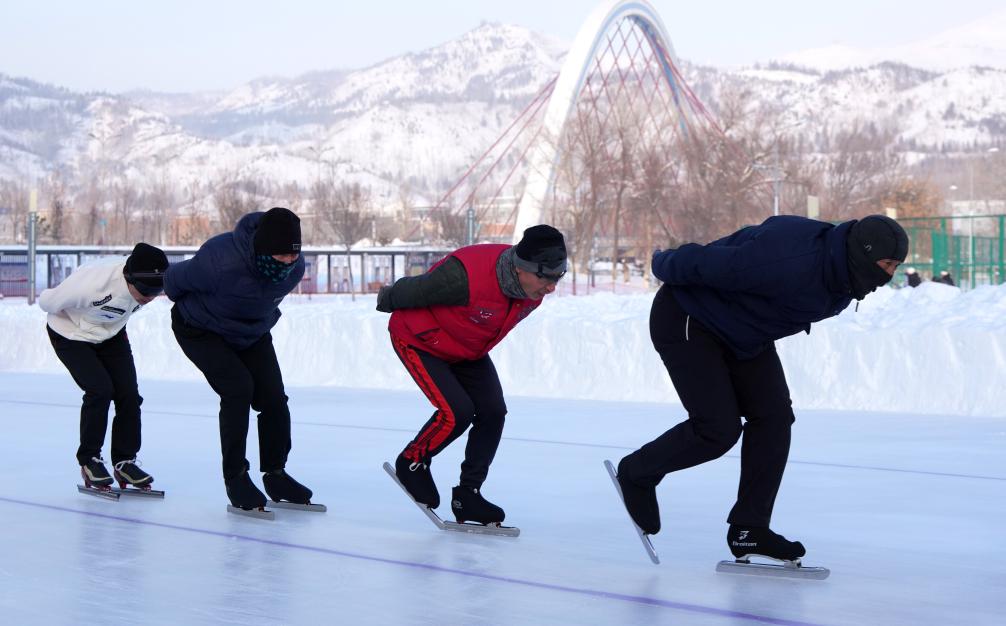 不一會兒,一群孩子涌入冰場,他們是阿勒泰市業(yè)余體校的小運(yùn)動員,年齡8到15歲不等。他們脫下厚重的棉衣,換上連身服,開始在冰面上滑行,在教練的指揮下,時(shí)而沖刺,時(shí)而慢行調(diào)整,輕快的腳步讓“老朋友們”贊嘆,“這些小孩厲害啊,比我們那會兒強(qiáng)多了”。