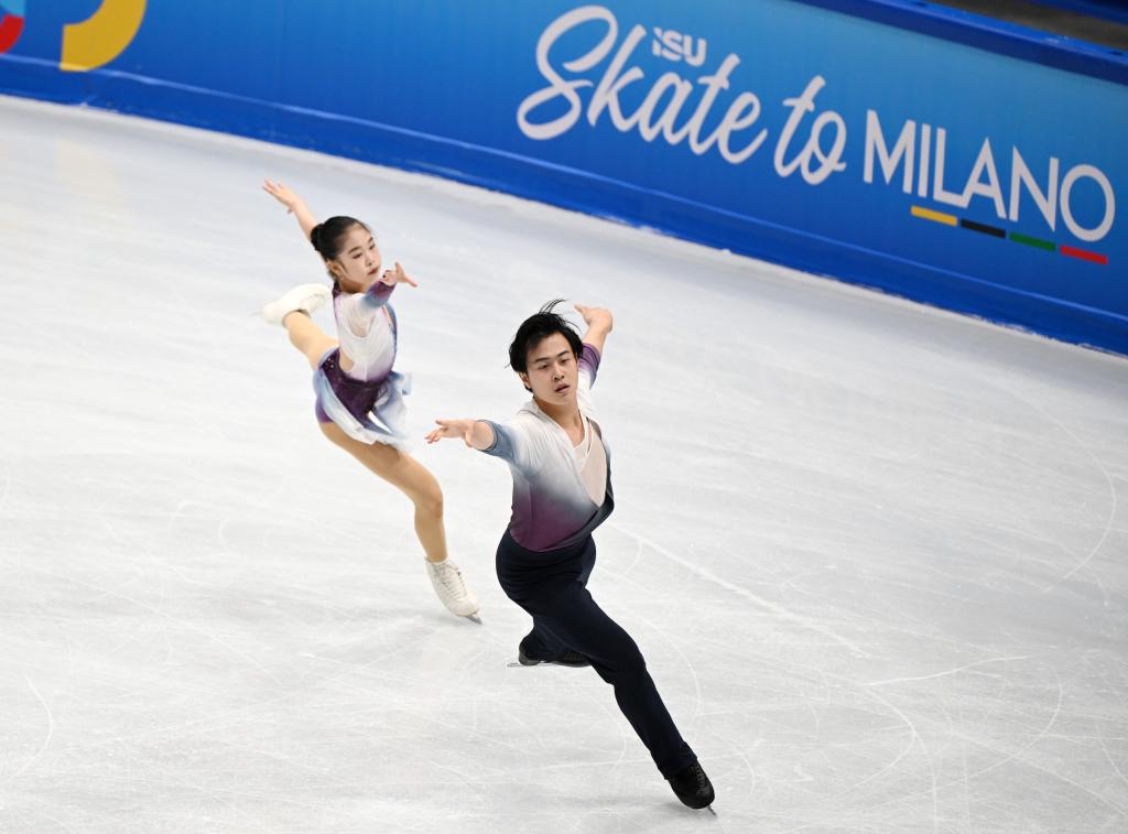 9月20日,張嘉軒/黃一航(右)在國(guó)際滑聯(lián)花樣滑冰奧運(yùn)資格賽雙人滑自由滑比賽中。新華社記者 張晨霖 攝