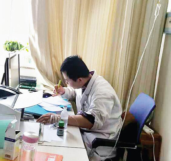 3月10日起,在微信朋友圈里,這張醫(yī)生掛吊瓶接診的照片引起了很多人的關(guān)注。照片中一名身穿白大褂的醫(yī)生正在值班室埋頭寫病歷,他的一只手上正輸著液體。筆者了解到,是一名病人的家屬上傳了這張照片。他的父親十幾天前曾在中醫(yī)院9樓心血管病房住院,在父親住院的一天,他去值班室詢問父親病情時,看到了徐強醫(yī)生打吊瓶堅持工作,這讓他十分感動,于是就悄悄用手機(jī)拍了照并上傳至微信朋友圈。