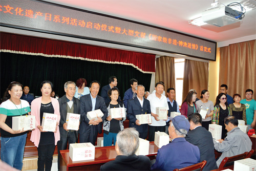 《國(guó)家級(jí)非物質(zhì)文化遺產(chǎn)·神池道情》首發(fā)儀式現(xiàn)場(chǎng)(劉文明 攝) □本報(bào)實(shí)習(xí)記者:郭咪 郭浩東 高君 許凈 王菲 雷蕾 2016年6月11日是我國(guó)第11個(gè)文化遺產(chǎn)日,各地都以不同的方式舉行紀(jì)念活動(dòng)。也正是在這一天,神池縣的紀(jì)念活動(dòng)別具一格,除了常規(guī)的紀(jì)念活動(dòng)之外,神池縣委宣傳部、縣文化局還舉辦了由山西文化學(xué)者、忻州日?qǐng)?bào)社高級(jí)編輯楊峻峰主編的大型文集《國(guó)家級(jí)非物質(zhì)文化遺產(chǎn)·神池道情》的首發(fā)儀式。該系列圖書被市委宣傳部、省委宣傳部列為重點(diǎn)文藝圖書進(jìn)行扶持。神池縣郵政局還為此首發(fā)式發(fā)行了紀(jì)念封,在首發(fā)儀式現(xiàn)場(chǎng)加蓋郵戳?!渡癯氐狼椤废盗袌D書的出版,對(duì)于保護(hù)、傳承、發(fā)揚(yáng)道情文化有著重大的意義,這天對(duì)于許多唱道情、愛道情的道情人來說,更像是他們的一場(chǎng)狂歡。 一部文集點(diǎn)燃狂歡的引擎 道情是我國(guó)眾多劇種中最古老的劇種之一,它始于傳播道教教義的道教音樂,盛唐時(shí)期搬上舞臺(tái),發(fā)端為戲劇形式,后來發(fā)展為民間的戲劇。其歷史久遠(yuǎn)、文化璀璨、內(nèi)容豐富、唱腔優(yōu)美,是戲劇界的一朵奇葩。我國(guó)唱道情的地方很多,其中神池道情具有代表性。神池道情不僅起源早、影響大,藝術(shù)表現(xiàn)完整,而且劇團(tuán)成立也較早、較為成熟,是現(xiàn)存道情藝術(shù)的主體。但是,近三十多年來,神池道情疏于保護(hù),隨著許多藝人的作古,許多音樂和劇目已經(jīng)失傳。為了保護(hù)、傳承神池道情這一非物質(zhì)文化遺產(chǎn),楊峻峰先生花費(fèi)20 多年時(shí)間,回神池,上大同,過朔州,到右玉,下太原,過呂梁,走訪了數(shù)十位道情藝人,收集了大量的道情資料和歷史圖片,編纂成五卷本《國(guó)家級(jí)非物質(zhì)文化遺產(chǎn)·神池道情》系列圖書,由中國(guó)戲劇出版社正式出版。叢書洋洋300 萬字,以歷史研究、劇目、音樂為框架,收錄了120多個(gè)劇目,300多首曲調(diào),108篇研究文章,對(duì)于研究和傳播神池道情有重大的藝術(shù)和史料價(jià)值。正是這部文集,勾起許多道情人美好的回憶,點(diǎn)燃了他們狂歡的火花。 幾十年后再相聚 6月11日上午,天氣微涼,但在神池縣委四樓會(huì)議室里,卻涌動(dòng)著一股暖流。人們看到,出席此次首發(fā)式的來賓主體是一位位精神矍鑠的道情藝人和道情劇團(tuán)創(chuàng)始人的后代,他們大多七八十歲,有的早在三四十年前就調(diào)離神池,有的退休后隨著子女在外地定居,許多老人已經(jīng)幾十年沒有回過神池,許多人已經(jīng)和神池失去了聯(lián)系,是楊峻峰在四處走訪時(shí)找到他們,才使他們和神池的道情人有了聯(lián)系。這次首發(fā)式和這部道情文集像一根紅線,將他們緊緊地拴在了一起,為了參加這次首發(fā)式,他們特地從四面八方趕來。 道情老藝人金月蓮,1976年調(diào)回了大同,四十年沒有回來,這次在兒子的護(hù)送下故地重游;老藝人蘆樹林、白映才夫婦,在晉城定居20多年,在女兒的陪同下回到神池。賈文秀調(diào)離神池已經(jīng)45年,雖離神池路程不遠(yuǎn),但幾十年沒回神池,這次也回來了。遠(yuǎn)嫁太原的老藝人李鴻貞,也應(yīng)邀回到神池。丑角演員趙振聲,退休后在朔州打工,時(shí)間很緊,但聞?dòng)嵑笤诎倜χ汹s回神池;還有定居原平的周興徐鳳蓮夫婦,定居忻州的藺鳳鳴李俊英夫婦、王政王青華夫婦、武兆鵬黃鳳蘭夫婦,還有馮文俊、李文、梁美琴等都專程趕回故鄉(xiāng)參加這次首發(fā)式,想見見多年不見的藝友們。藝人們還見到了1970年為保護(hù)神池道情劇團(tuán)不被撤銷而立下汗馬功勞的原神池縣委常委、縣委辦主任李貴元,他專門為這套叢書寫下三萬多字的回憶文章,這次他是以撰稿人的身份被請(qǐng)回來的。 八十個(gè)座位的會(huì)議室出現(xiàn)了罕見的爆滿,擠進(jìn)了近百人,除了受邀的道情劇團(tuán)創(chuàng)始人的后代和老藝人們,還有歷任神池劇團(tuán)的團(tuán)長(zhǎng)、民營(yíng)道情劇團(tuán)的負(fù)責(zé)人,以及許多活躍在神池大地上的實(shí)力派道情演員和熱愛道情的文學(xué)愛好者,都聞?dòng)嵹s去,想看看熱鬧,索要一套叢書。原神池道情劇團(tuán)副團(tuán)長(zhǎng)、著名道情表演藝術(shù)家藺鳳鳴激動(dòng)地說:“我唱了一輩子道情,愛了一輩子道情,今天是我最高興的一天!” |