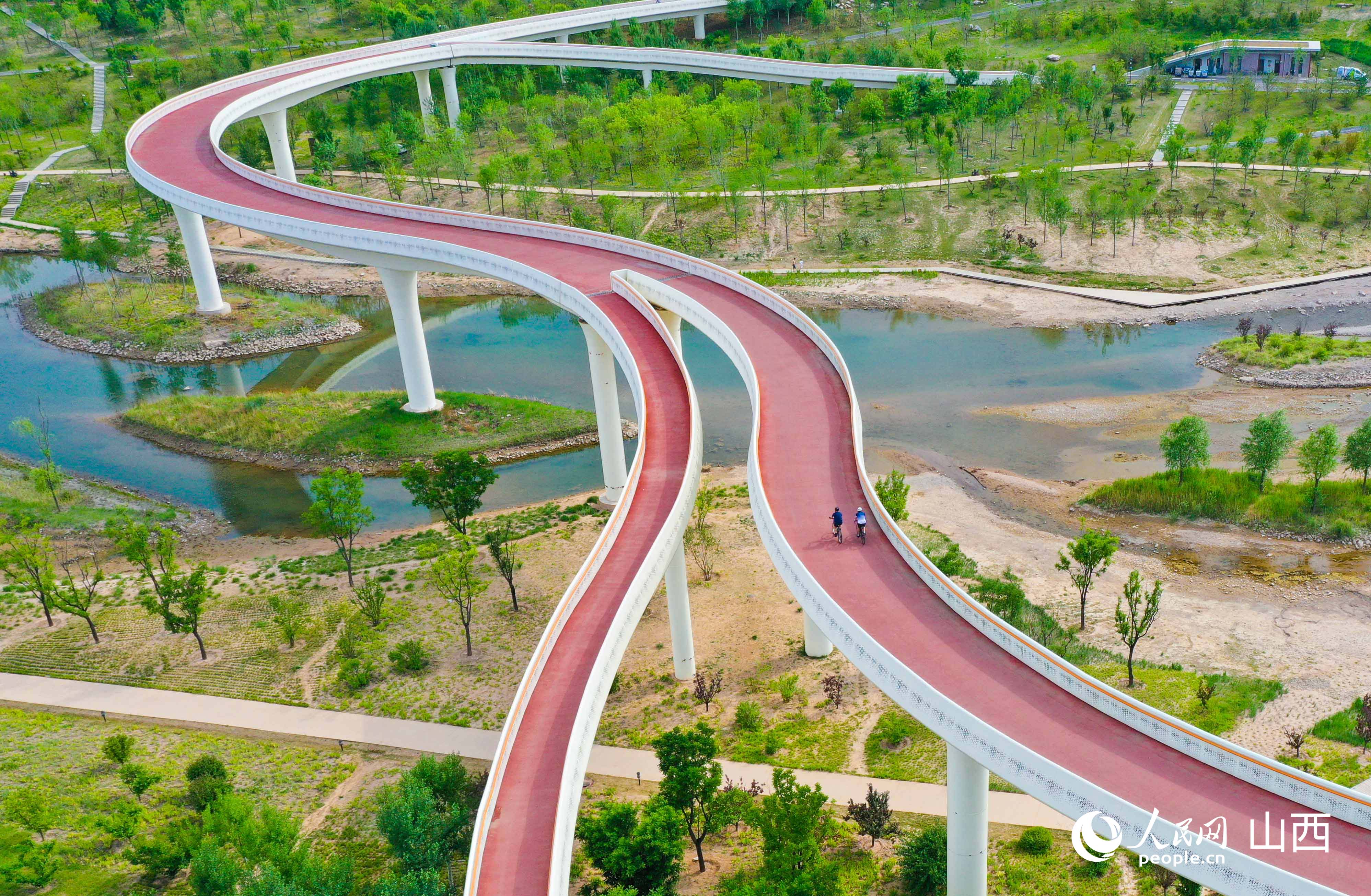 6月22日,俯瞰山西太原汾河四期濕地公園,雁丘園綠意盎然,水面波光粼粼,一派生機(jī)盎然,勾畫出一幅自然和諧的生態(tài)美景。