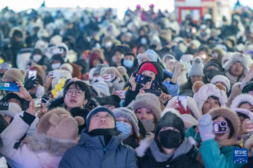 在哈爾濱冰雪大世界園區(qū),游客觀看第40屆中國·哈爾濱國際冰雪節(jié)開幕式(1月5日攝)。新華社記者 謝劍飛 攝