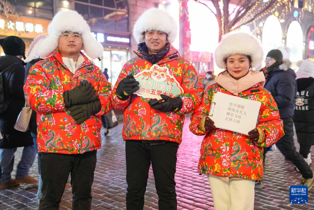 在哈爾濱市道里區(qū)中央大街,當?shù)厝送ㄟ^東北方言問答送禮品的方式歡迎外地游客(1月3日攝)。新華社記者 謝劍飛 攝