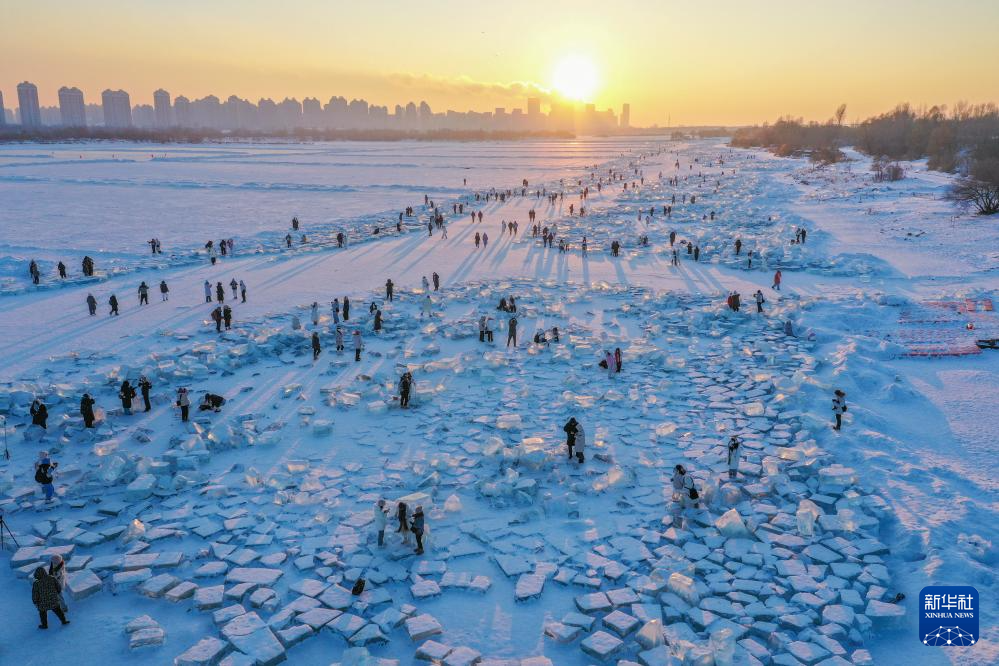 在封凍的松花江哈爾濱段,游客在日落時分的“鉆石?!庇瓮妫o人機照片,1月7日攝)。新華社記者 謝劍飛 攝