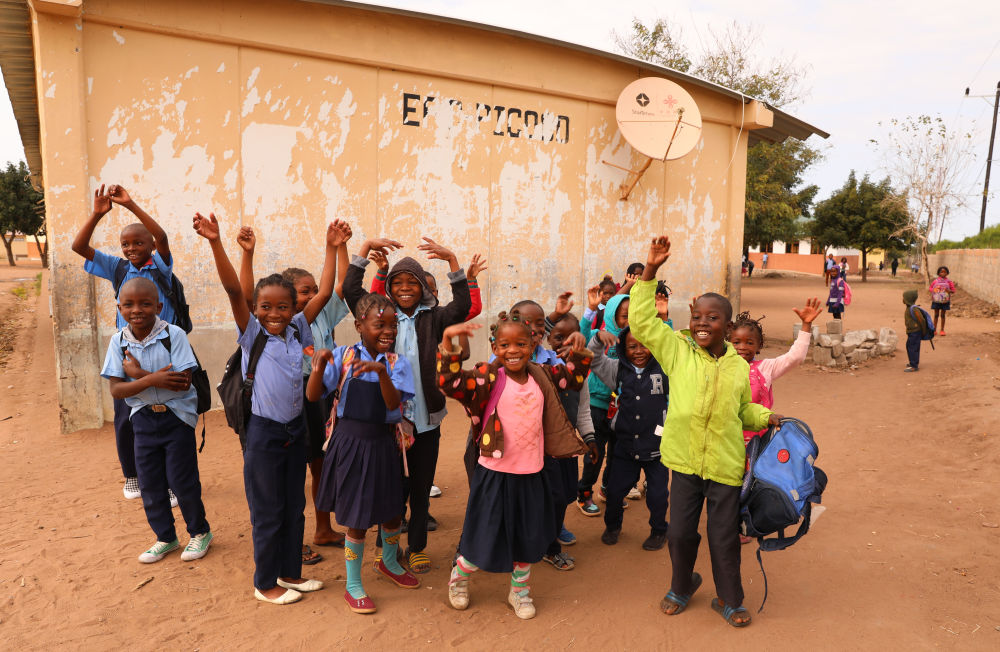 2023年7月25日,莫桑比克馬普托省皮科科村學(xué)校的孩子們站在裝有中國援助的衛(wèi)星電視接收天線的房屋前?!叭f村通”項(xiàng)目旨在為非洲國家的1萬個(gè)村莊接入衛(wèi)星數(shù)字電視信號,項(xiàng)目2018年在莫桑比克啟動,為該國1000個(gè)村落、2萬戶家庭和3000個(gè)公共場所安裝衛(wèi)星電視設(shè)備,提供電視信號和節(jié)目,覆蓋農(nóng)村人口達(dá)250萬。新華社記者 董江輝 攝