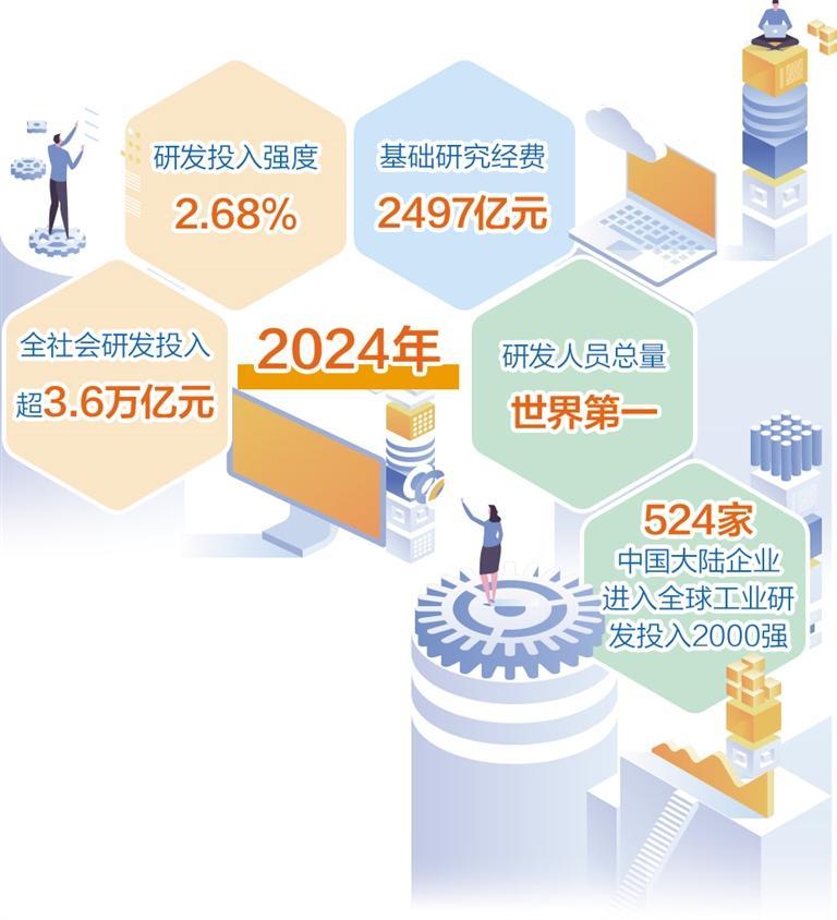 科技投入持續(xù)增加。2024年全社會(huì)研發(fā)投入超3.6萬(wàn)億元,較2020年增長(zhǎng)48%;研發(fā)投入強(qiáng)度達(dá)2.68%,超過(guò)歐盟國(guó)家平均水平;研發(fā)人員總量世界第一?;A(chǔ)研究經(jīng)費(fèi)達(dá)2497億元,較2020年增長(zhǎng)超過(guò)70%,在量子科技、生命科學(xué)、物質(zhì)科學(xué)、空間科學(xué)等領(lǐng)域取得一批重大原創(chuàng)性成果,高水平國(guó)際期刊論文數(shù)量和國(guó)際專利申請(qǐng)量連續(xù)5年世界第一。