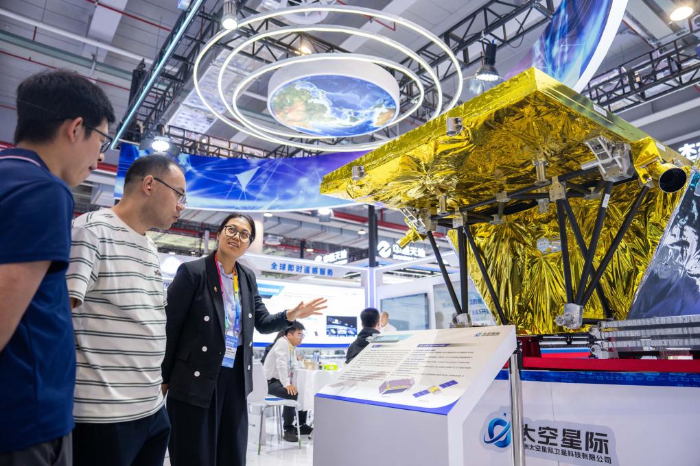 9月24日,第四屆北斗規(guī)模應(yīng)用國際峰會(huì)在湖南株洲開幕。圖為在株洲國際會(huì)展中心,工作人員(左三)在介紹一臺(tái)對(duì)地觀測(cè)衛(wèi)星。新華社記者 陳思汗 攝