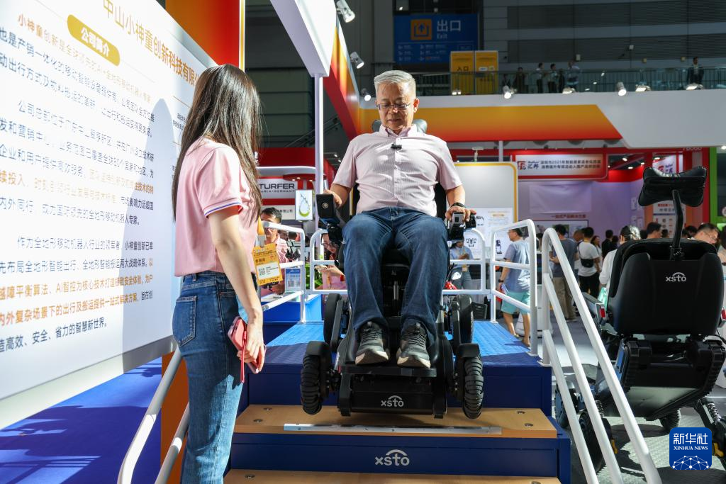 9月12日,觀眾在國際智慧養(yǎng)老產(chǎn)業(yè)博覽會(huì)現(xiàn)場(chǎng)體驗(yàn)智能出行機(jī)器人。新華社記者 梁旭 攝