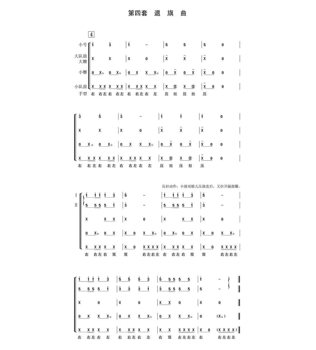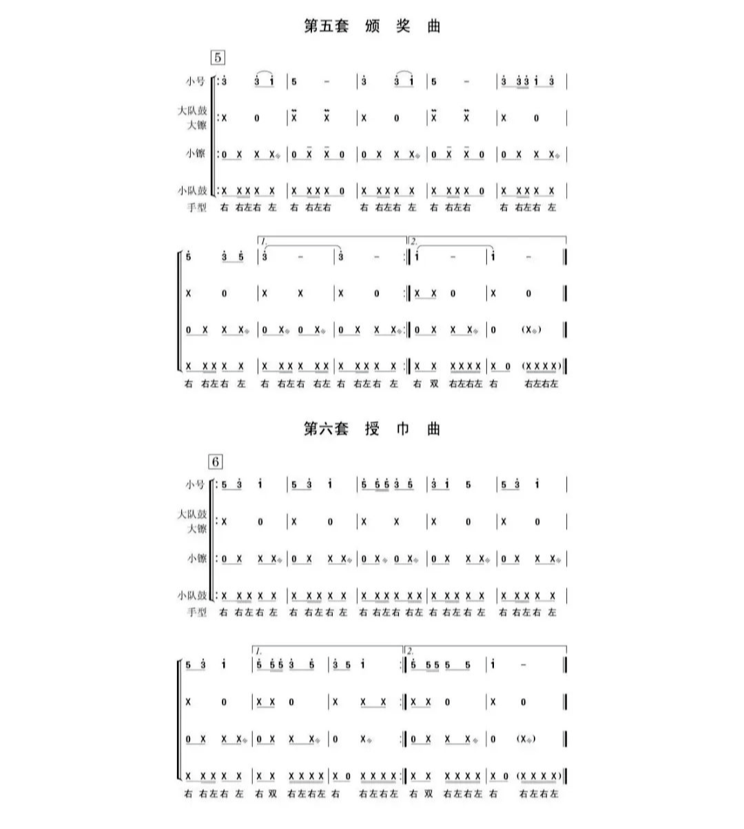 少先隊(duì)鼓號(hào)隊(duì)總譜除間奏鼓外共10套曲目,包括:開場(chǎng)曲、進(jìn)行曲、出旗曲、退旗曲、頒獎(jiǎng)曲、授巾曲、檢閱曲、宣誓曲、迎賓曲、歡送曲。