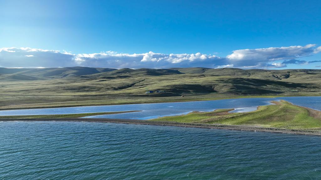 7月25日拍攝的尕日塘秦刻石所在地青海省果洛藏族自治州瑪多縣扎陵湖北岸(無(wú)人機(jī)照片)。新華社記者 杜笑微 攝