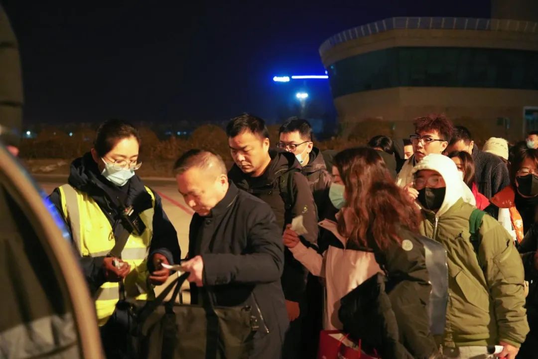 為了早點回家,旅客們披星戴月,趕最早的航班。太原機場地服人員更是早早守候在停機坪,幫旅客檢票登機。