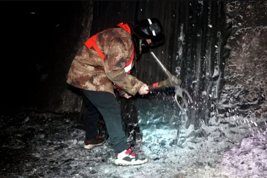 “咣當咣當……”,為了讓列車安全通過隧道,大同工務(wù)段的鐵路“打冰人”掄著尖鎬,狠狠地砸向拱壁上的冰柱,加緊隧道內(nèi)的除冰作業(yè)。