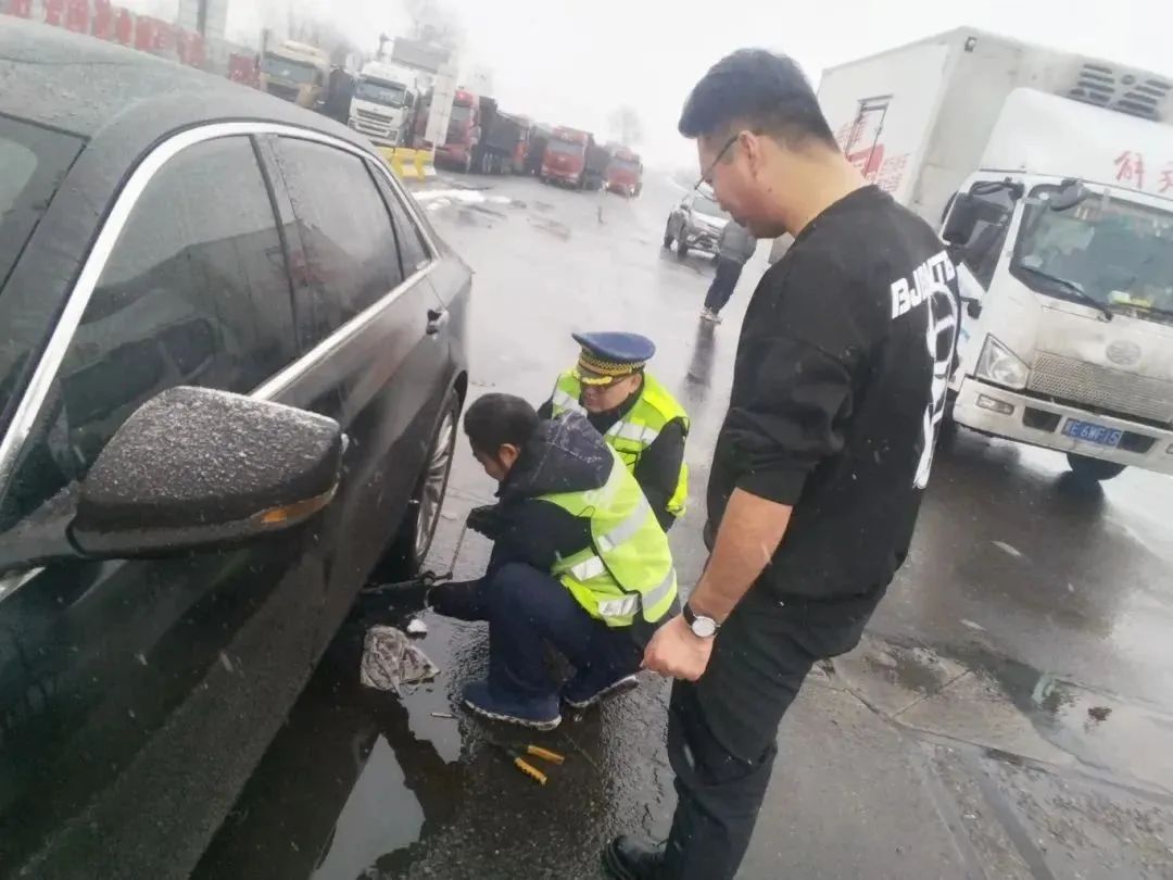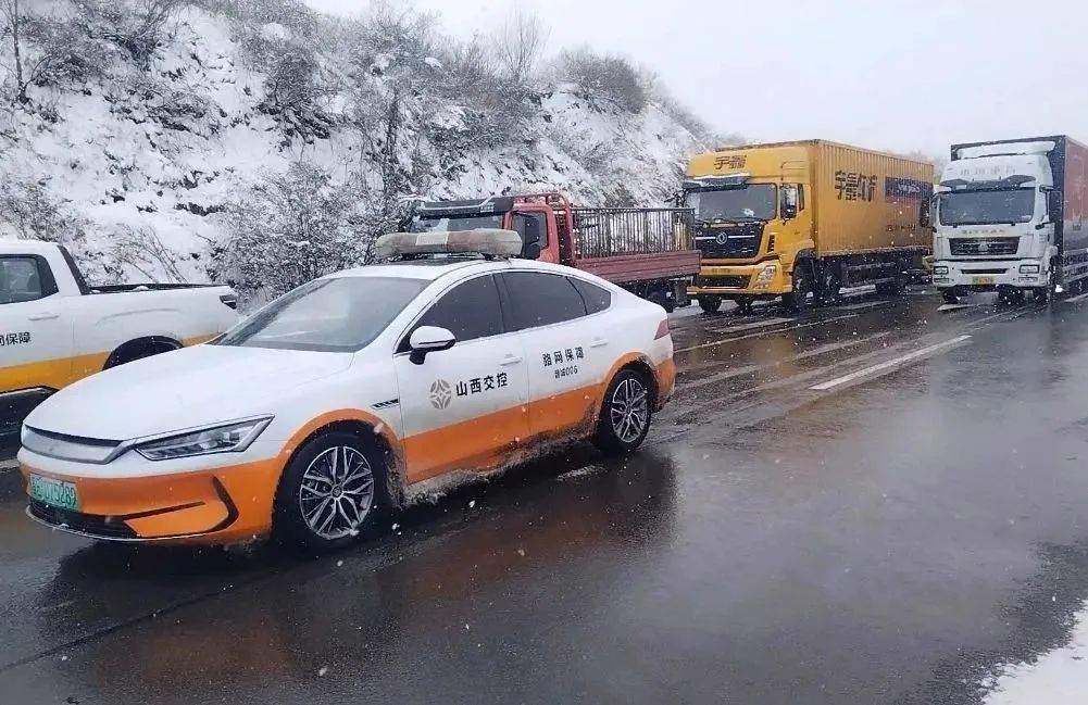 降雪過后,高速路上路面濕滑,山西高速交警和交控集團人員為乘客開道,一路護送,保障旅客平安回家。