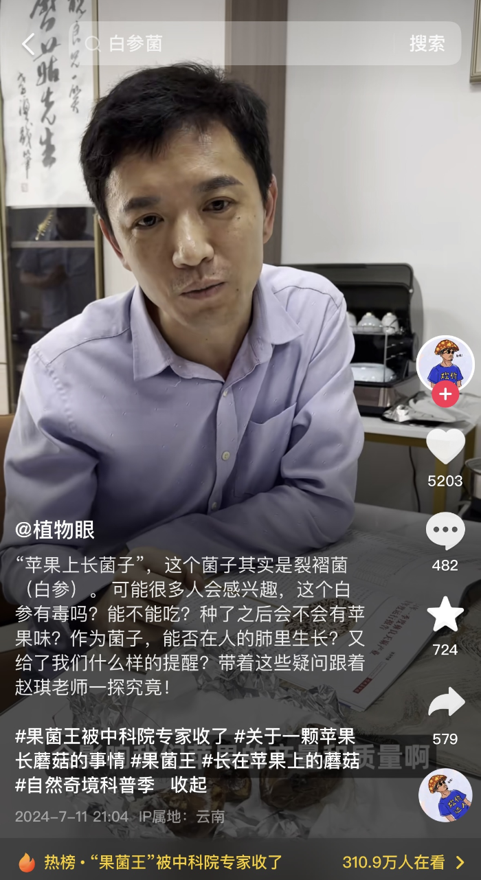 拿到樣本后,許博士對(duì)蘋(píng)果做了切片觀察,還在抖音上向網(wǎng)友實(shí)時(shí)更新起了菌絲生長(zhǎng)情況,引發(fā)越來(lái)越多網(wǎng)友的“追更”。之后又有科普創(chuàng)作者@植物眼 專門(mén)采訪許博士的導(dǎo)師趙琪,他的細(xì)致講解讓很多網(wǎng)友紛紛表示“又學(xué)到了新知識(shí)”。