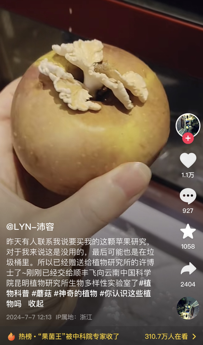 一顆“長(zhǎng)菌蘋(píng)果”的奇幻漂流,引發(fā)了媒體聚焦。據(jù)潮新聞報(bào)道,上個(gè)月末,浙江梅雨不斷。浙江德清的鄧小姐發(fā)現(xiàn),家里放了一個(gè)多月的蘋(píng)果上,竟長(zhǎng)出了白色的蘑菇。她在抖音上曬出圖片,登上抖音熱榜,那顆“長(zhǎng)菌蘋(píng)果”被網(wǎng)友戲稱為“果菌王”。
