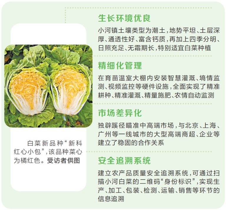 “小河白菜跳出‘白菜價’,我們最大的底氣便是好的品種培育?!本G源農(nóng)牧總經(jīng)理張躍民介紹,他從2008年開始流轉(zhuǎn)600余畝土地規(guī)模化種植小河白菜,品種大部分來自新鄉(xiāng)市農(nóng)科院蔬菜研究團隊。往年該公司主要種植的白菜品種為“新科小包26”,一棵也能賣到39元。
