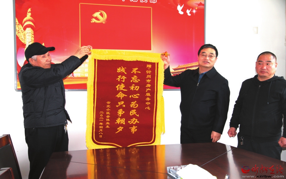 本報(bào)訊 4月14日上午,市房產(chǎn)服務(wù)中心三樓會(huì)議室內(nèi),云北小區(qū)居民和物業(yè)公司員工十幾個(gè)人,滿(mǎn)懷著感激之情,手捧著寫(xiě)有“不忘初心為民辦事、踐行使命只爭(zhēng)朝夕”的一面錦旗,送給了市房產(chǎn)服務(wù)中心,落款為:云北小區(qū)全體居民。