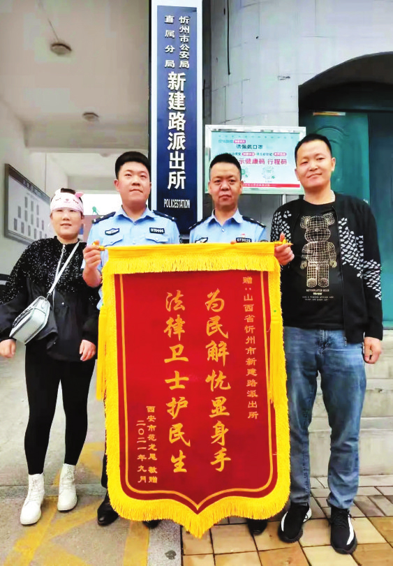 近日,一對西安夫婦將一面錦旗送到了忻州市公安局直屬分局新建路派出所,紅絨絨的錦旗上繡著14個金黃大字:“為民解憂顯身手,法律衛(wèi)士護(hù)民生。”