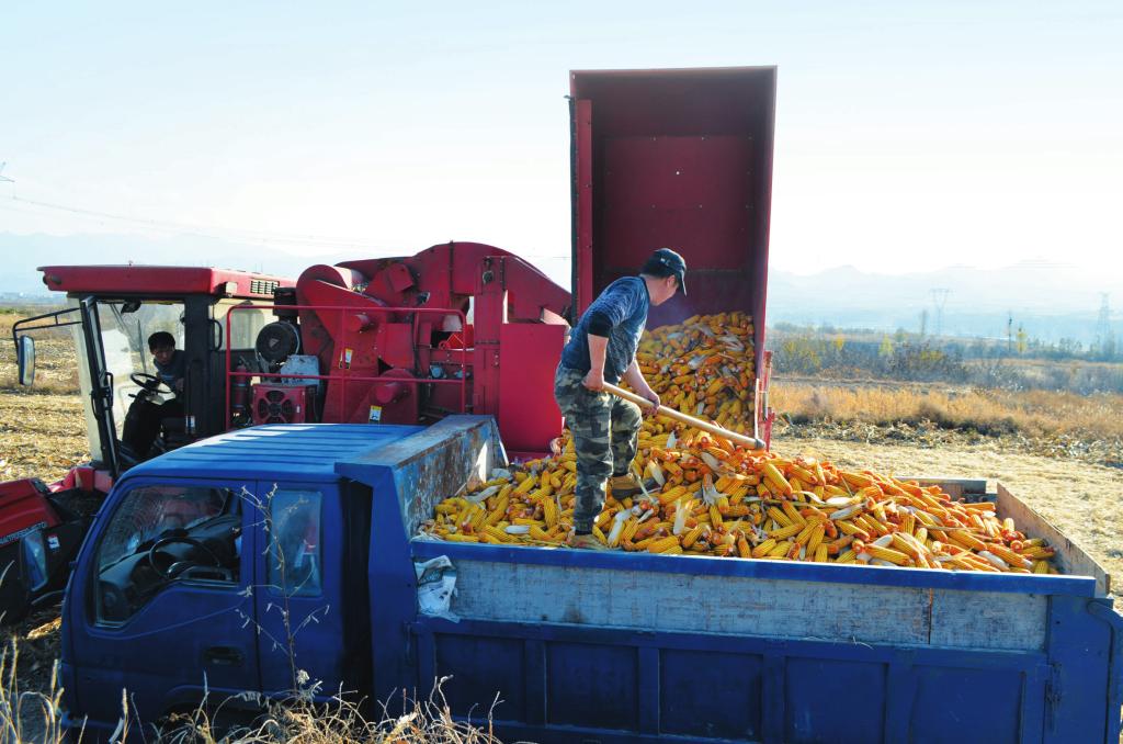 五臺(tái)縣東冶鎮(zhèn)北一村積極推進(jìn)土地確權(quán)流轉(zhuǎn),使外出村民棄耕和管理不善的土地向種田能手集中。村民王春明流轉(zhuǎn)土地800畝,并購(gòu)置了大型農(nóng)機(jī)具,進(jìn)行科學(xué)種植,實(shí)現(xiàn)了增收致富。圖為王春明利用收割機(jī)搶收玉米,保證顆粒歸倉(cāng)。 (王金龍 攝)