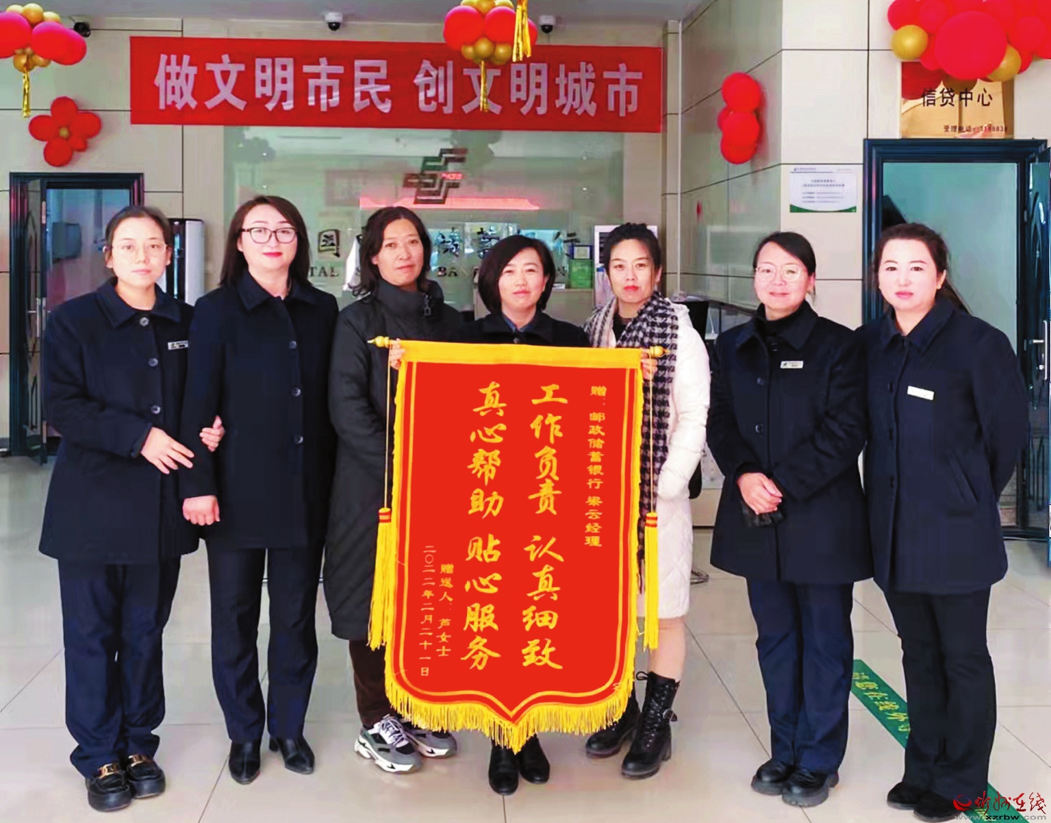 2月21日,市民蘆女士將一面印有“工作負責(zé) 認真細致 真心幫助 貼心服務(wù)”的錦旗送到郵儲銀行忻州市分行人民公園支行,由衷感謝理財經(jīng)理梁云認真負責(zé)、高效便民的優(yōu)質(zhì)服務(wù)。 (王 杰 攝)