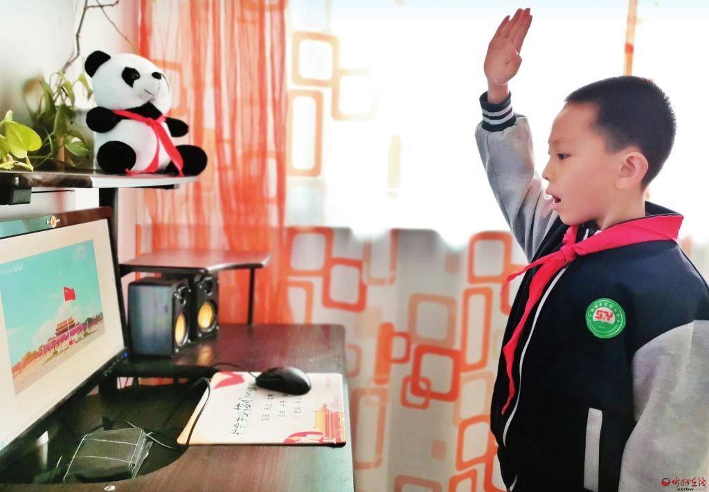 2月28日上午,在我市疫情防控的背景下,市實(shí)驗(yàn)小學(xué)學(xué)生在家里準(zhǔn)時(shí)參加學(xué)校組織的線上升國(guó)旗儀式。圖為一名小學(xué)生隔著屏幕,向國(guó)旗敬禮。 (宮清華 攝)