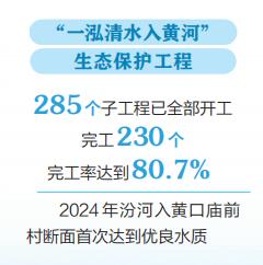與此同時(shí),我省牢記習(xí)近平總書記寄予山西“一泓清水入黃河”的殷切期盼,2023年6月,啟動(dòng)了“一泓清水入黃河”生態(tài)保護(hù)工程,計(jì)劃用三年時(shí)間,對(duì)黃河的第二大支流——汾河,進(jìn)行全流域、全方位治理?!耙汇逅朦S河”生態(tài)保護(hù)工程在聚焦水質(zhì)改善目標(biāo)的基礎(chǔ)上,銜接水網(wǎng)建設(shè)、防洪能力提升、黑臭水體治理等多種類型,通過上下游、干支流、左右岸、水陸域一體謀劃,治污、調(diào)水、清淤、增濕、綠岸一體實(shí)施,取得了初步的生態(tài)效益、社會(huì)效益、經(jīng)濟(jì)效益。如今,285個(gè)子工程已完工230個(gè)、完工率達(dá)到80.7%。