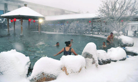 初冬,清晨的薄霧尚未散盡,“溫泉之鄉(xiāng)”奇村鎮(zhèn)南高村的溫泉民宿小院里,來自內(nèi)蒙古包頭的游客杜鵬程正悠閑地泡著溫泉?!懊磕赀@時候都來住上一個月,老寒腿舒服多了?!彼麗芤獾卣f。