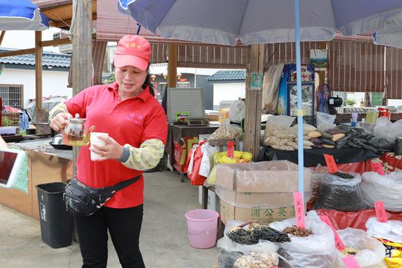 村民陸秀媚的攤位琳瑯滿(mǎn)目,擺得滿(mǎn)滿(mǎn)當(dāng)當(dāng)。求是記者 張芯蕊 攝