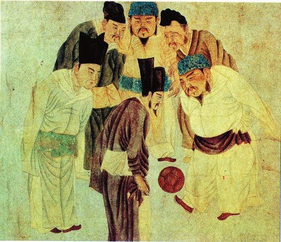 (元)錢 選 《宋太祖蹴鞠圖》 后來,鞠演變成用動物皮毛縫制、中間填充毛發(fā)的皮球,方便人們踢動,蹴鞠運動也開始從軍營走向民間。據(jù)《西京雜記》載,劉邦父親劉太公自幼“斗雞、蹴鞠,以此為歡”,西漢建立后父以子貴成為太上皇,搬進九重深宮的他整日悶悶不樂,劉邦就在皇宮附近建了一座新豐城,讓父親當年的好友在城中陪其斗雞、蹴鞠,頤養(yǎng)天年。 到了唐代,鞠的制作技術(shù)得到改良,球殼從兩片皮合成改為八片堅皮縫制,形狀更圓,球體更輕,可以踢得更高更遠,王維有“蹴鞠屢過飛鳥上,秋千競出垂楊里”之語。蹴鞠由此擺脫了軍事訓練色彩,成為民間喜聞樂見的運動項目。唐代還有女子蹴鞠,不求踢進球門,而以踢出花樣為能事,俗稱“白打”。 兩宋時期,鞠從八片堅皮縫制發(fā)展成十二片香皮砌成,且“不漏線角”,重量“正重十二兩”,外形“硬湊十分圓”。工藝的改進推動了球技的發(fā)展,出現(xiàn)了高俅、柳三復等憑借高超球技獲得官位的蹴鞠高手。