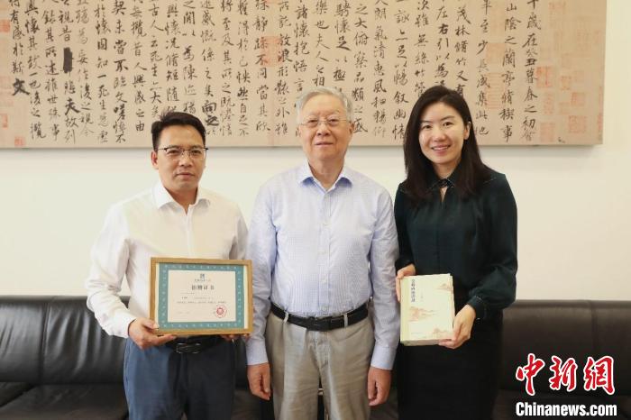 李紅強(qiáng)總編輯(左)代表人民文學(xué)出版社向國家圖書館捐贈《莫礪鋒演講錄》一種三冊,霍瑞娟副館長(右)代表國家圖書館接受捐贈并頒發(fā)證書。儀式后雙方與莫礪鋒教授(中)合影。 主辦方供圖