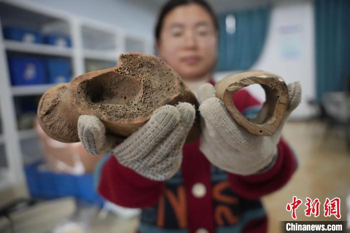 據(jù)中國人民大學歷史學院考古文博系從事科技考古研究的吳曉桐介紹,這次發(fā)現(xiàn)的牛、羊、馬、豬等動物骨骼,很多有切割、打磨、鉆孔的加工痕跡,屬于骨器半成品,推測這些骨骼被用來制作骨器。