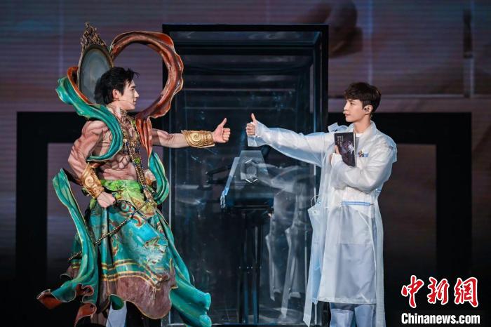 《受到召喚·敦煌》運(yùn)用了“AI+3D+即時(shí)影像+真人動(dòng)畫融合”技術(shù),以高色階大屏,打破了傳統(tǒng)的觀演模式和舞臺(tái)空間,巧妙地融合了歷史與未來、東方與西方文化元素,構(gòu)建起沉浸式觀演空間。舞臺(tái)上,當(dāng)數(shù)字修復(fù)的莫高窟壁畫徐徐展開時(shí),21世紀(jì)30年代的敦煌數(shù)字研究中心實(shí)習(xí)生張燃與20世紀(jì)30年代的“敦煌守護(hù)神”常書鴻,跨越一個(gè)世紀(jì),展開時(shí)空對(duì)話,給現(xiàn)場觀眾留下了深刻印象。