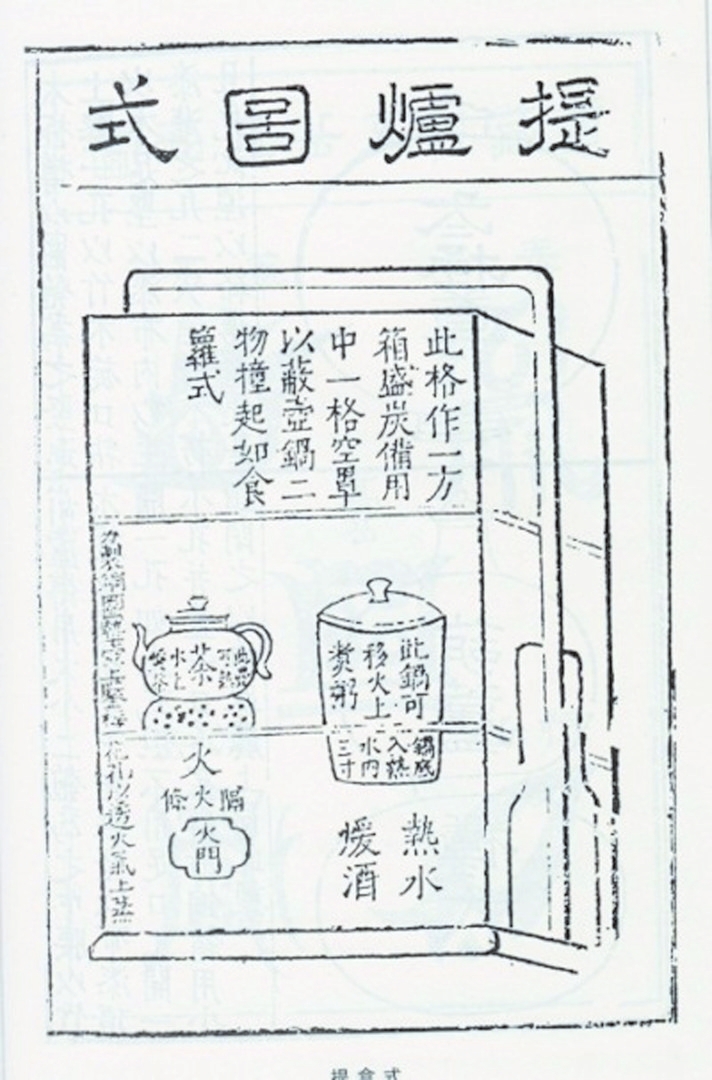 明代戲曲家高濂編撰的《遵生八箋》,可謂士大夫精致生活的指導(dǎo)書,書中仔細(xì)介紹了提爐的形制與結(jié)構(gòu),還附上了插圖。書云:“式如提盒,亦余制也。高一尺八寸,闊一尺,長(zhǎng)一尺二寸,作三撞。下層一格,如方匣,內(nèi)用銅造水火爐,身如匣方,坐嵌匣內(nèi)。中分二孔,左孔炷火,置茶壺以供茶;右孔注湯,置一桶子小鑊有蓋,頓湯中煮酒。長(zhǎng)日午余,此鑊可煮粥供客。傍鑿一小孔,出灰進(jìn)風(fēng)。其壺鑊迥出爐格上,太露不雅,外作如下格方匣一格,但不用底以罩之,便壺鑊不外見也。一虛一實(shí)共二格,上加一格,置底蓋以裝炭,總?cè)癯梢患?,上可箾關(guān),與提盒作一副也。”