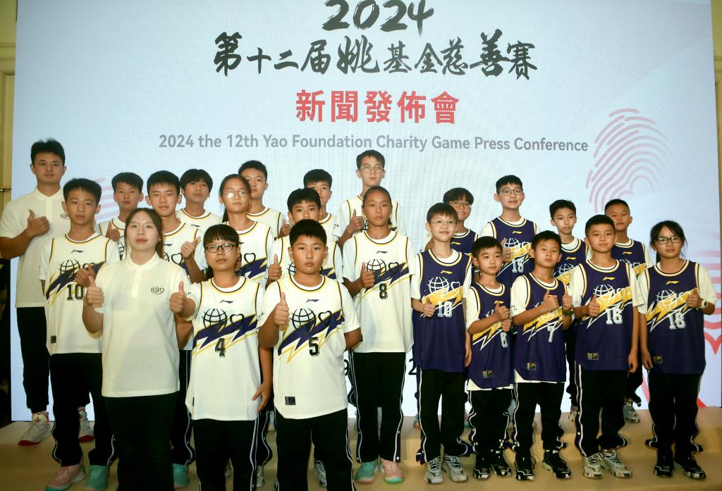 8月19日,姚基金小球員在新聞發(fā)布會上合影。新華社記者 盧炳輝 攝