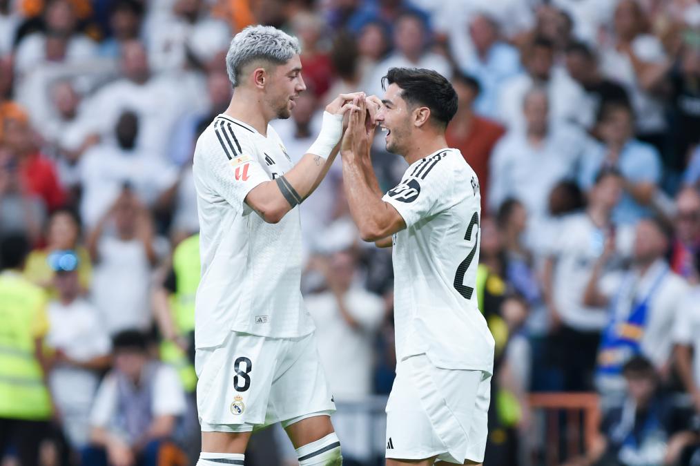 8月25日,皇家馬德里隊球員巴爾韋德(左)與隊友迪亞斯在比賽中慶祝進(jìn)球。新華社發(fā)(古斯塔沃·巴連特攝)