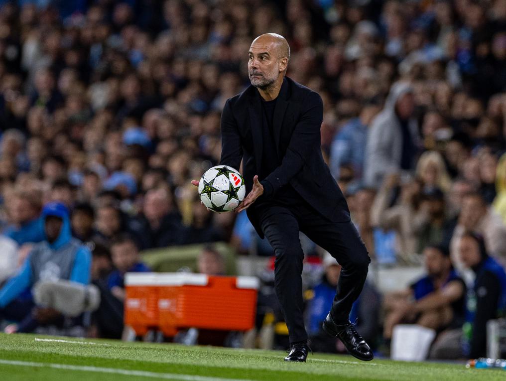 9月18日,曼徹斯特城隊主帥瓜迪奧拉在場邊撿球。新華社發(fā)