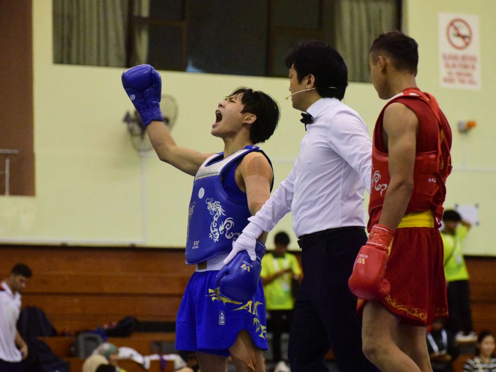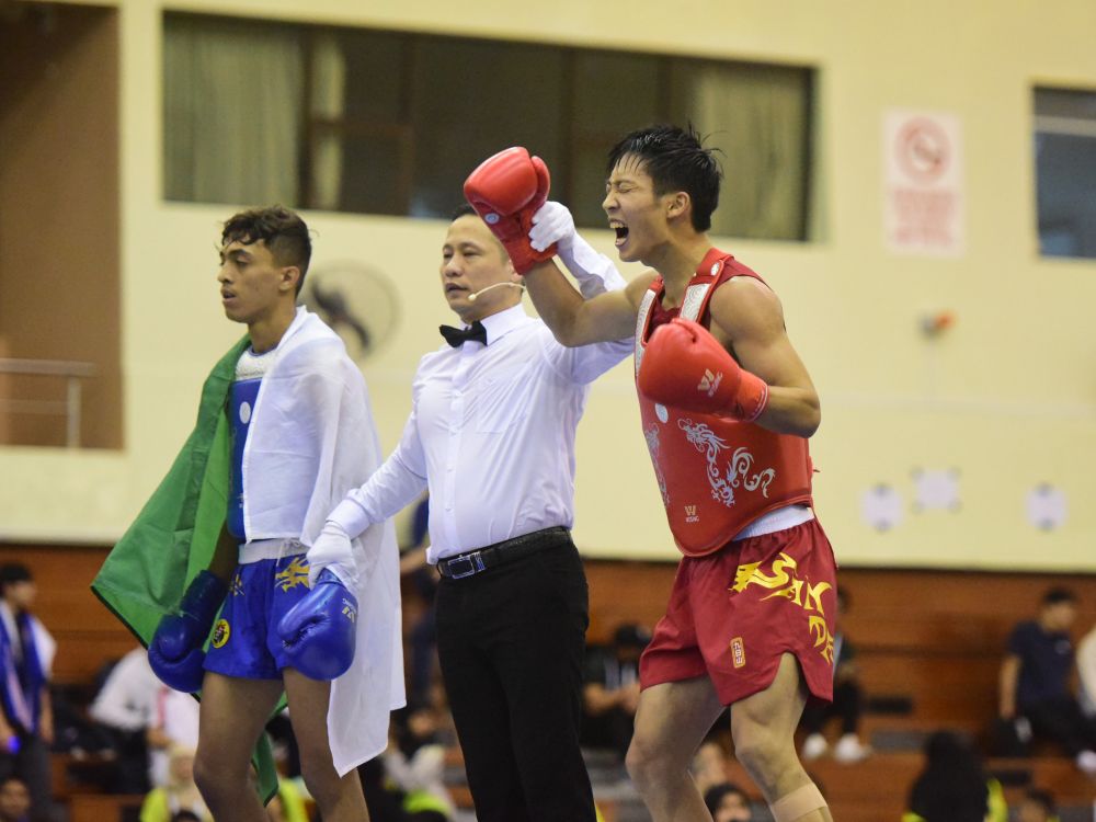 9月29日,在文萊舉行的第九屆世界青少年武術(shù)錦標賽散打男子56公斤級決賽中,中國選手馮俊杰戰(zhàn)勝烏茲別克斯坦選手奧季洛夫,獲得冠軍。新華社記者 李萌 攝