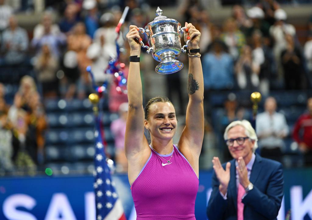 2024年9月7日,薩巴倫卡在頒獎(jiǎng)儀式上高舉獎(jiǎng)杯。當(dāng)日,在2024美國(guó)網(wǎng)球公開(kāi)賽女子單打決賽中,白俄羅斯選手薩巴倫卡2比0戰(zhàn)勝美國(guó)選手佩古拉,獲得冠軍。新華社記者 李睿 攝