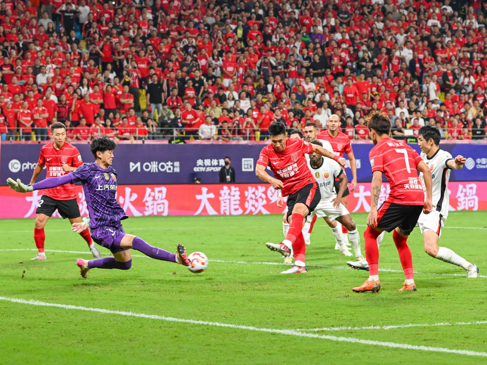 8月30日,成都蓉城隊球員楊帥(左三)在比賽中射門。當(dāng)日,在四川成都進行的中國足球超級聯(lián)賽第23輪比賽中,成都蓉城隊主場4:1戰(zhàn)勝上海海港隊。新華社記者 王曦 攝