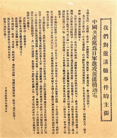九一八事變后的第三天,中共中央發(fā)表宣言,號召全中國工農勞苦民眾“一致動員武裝起來,給日本強盜與一切帝國主義以嚴重的回答”。七七事變后的第二天,中共中央向全國發(fā)出通電,號召“筑成民族統(tǒng)一戰(zhàn)線的堅固長城,抵抗日寇的侵掠”。七七事變成為中國全民族抗戰(zhàn)的開端,由此開辟了世界反法西斯戰(zhàn)爭的東方主戰(zhàn)場。