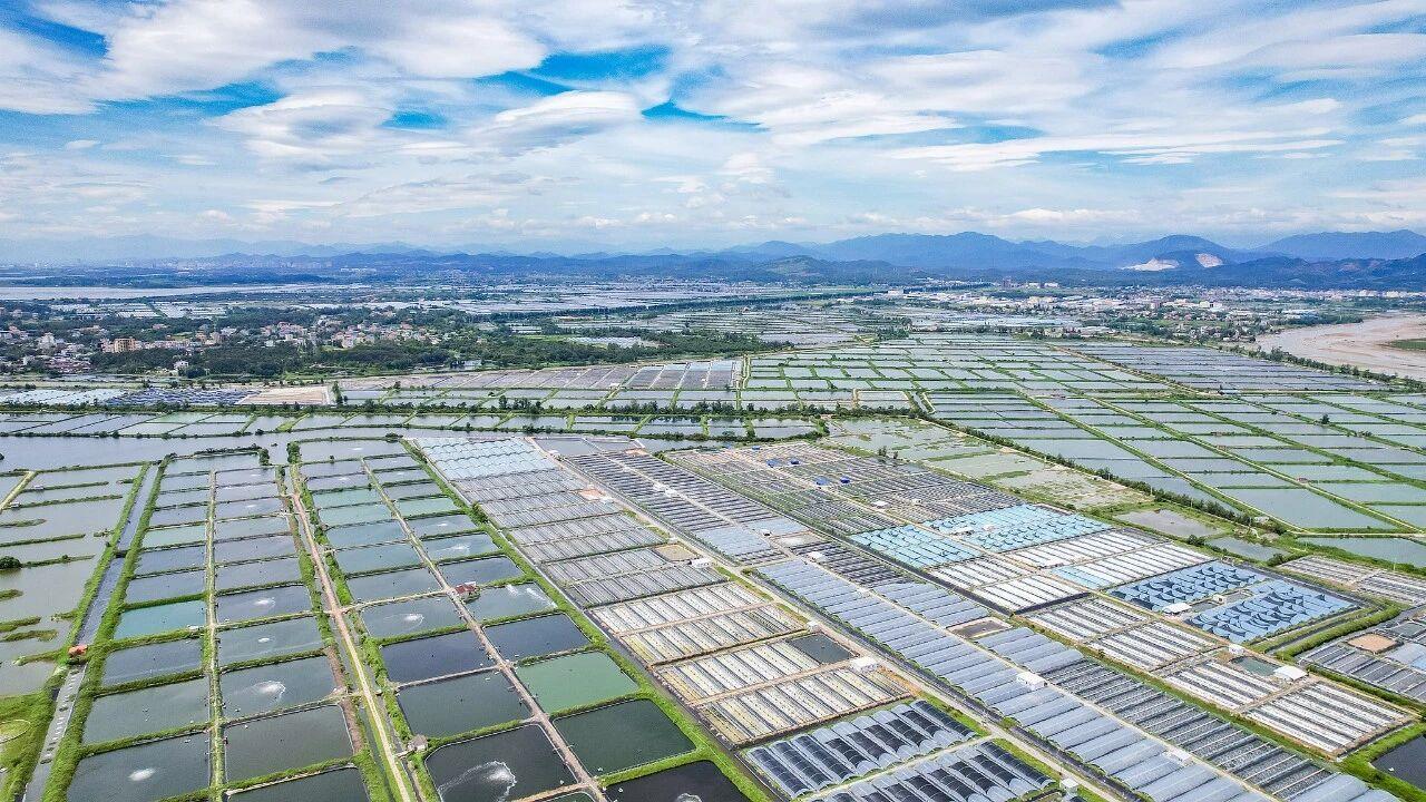 △廣西防城港東興市江平鎮(zhèn)魚塘縱橫交錯,與藍(lán)天白云、村舍相互形成一幅鄉(xiāng)村振興圖。