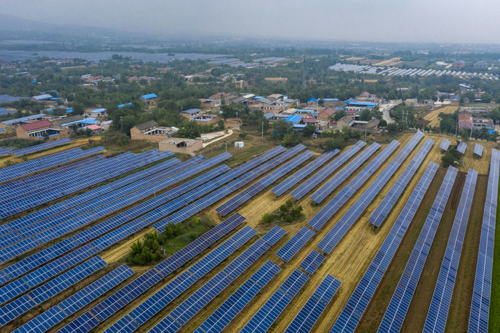 2025年6月25日在山西省運(yùn)城市芮城縣夭上村拍攝的光伏基地(無(wú)人機(jī)照片)。新華社記者 楊晨光 攝
