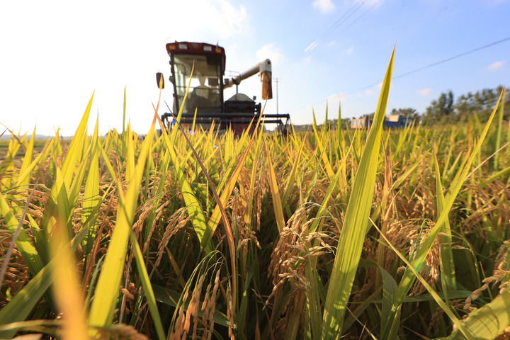2025年10月16日,在江蘇省連云港市贛榆區(qū)城頭鎮(zhèn)中青墩村,種植戶(hù)駕駛收割機(jī)搶收水稻。新華社發(fā)(司偉攝)