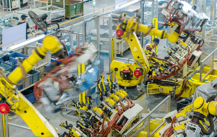 2025年10月9日,浙江省湖州市長(zhǎng)興經(jīng)濟(jì)技術(shù)開(kāi)發(fā)區(qū)的長(zhǎng)興地通汽車(chē)部件有限公司技術(shù)人員操控工業(yè)機(jī)器人生產(chǎn)新能源汽車(chē)配件(無(wú)人機(jī)照片)。新華社發(fā)(譚云俸攝)