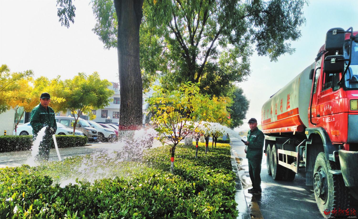 10月15日,園林工人正在忻州城區(qū)長征西街澆灌道路兩旁的綠植,精心養(yǎng)護,讓綠化成果成為城市的亮點。 (宮清華 攝)