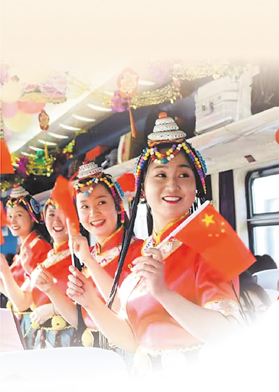 西寧開往拉薩的列車上,乘務人員與旅客聯(lián)歡。資料照片