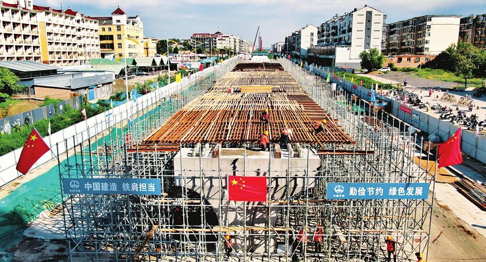 10月2日,臨汾市五一路快速通道工程西段,施工人員全力奮戰(zhàn),模板支撐體系的搭建已初步成型。據(jù)了解,施工人員將利用國(guó)慶假期,完成200米的模板支撐體系的搭建工作,用辛勤的勞動(dòng)和舞動(dòng)的青春為城市發(fā)展添磚加瓦。(本報(bào)記者 王瑞瑞 攝)